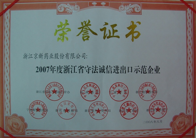 為樹立守法誠信進(jìn)出口企業(yè)典型,推進(jìn)進(jìn)出口企業(yè)誠信體系建設(shè),浙江省打私與海防口岸辦、杭州海關(guān)、寧波海關(guān)、浙江檢驗檢疫局、寧波檢驗檢疫局、省國稅局、省外匯管理局、省工商局、省外經(jīng)貿(mào)廳聯(lián)合在全省范圍內(nèi)開展了2007年度守法誠信進(jìn)出口示范企業(yè)推薦活動。經(jīng)各市打私辦與有關(guān)職能部門共同推薦,省級有關(guān)部門共同審核,公布了2007年度浙江省守法誠信進(jìn)出口示范企業(yè),我公司榜上有名。