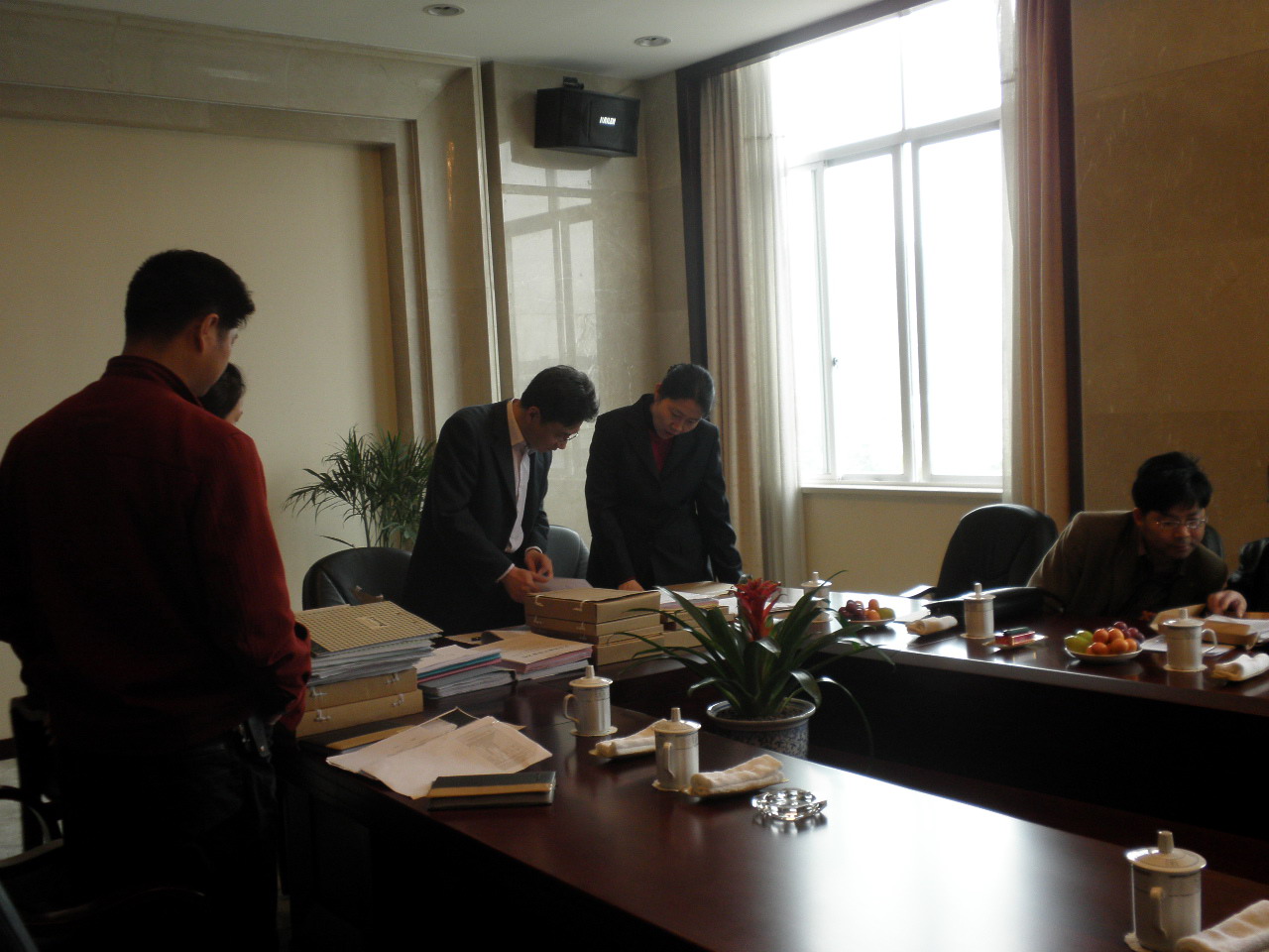 圖為市創建勞動關系和諧企業考評小組成員檢查相關資料