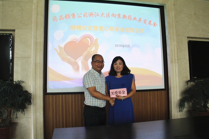 8月7日上午,一場簡短而溫馨的儀式在公司行政樓一樓會議室舉行。藥品銷售公司劉順軍經理代表浙江大區全體干部員工將12000元部門活動經費捐贈給公司“關愛基金”,并將其中4000元資助給公司2名困難同事的子女上大學,工會主席何蘇紅和2名學子接受了這凝聚著濃濃愛心的款項。