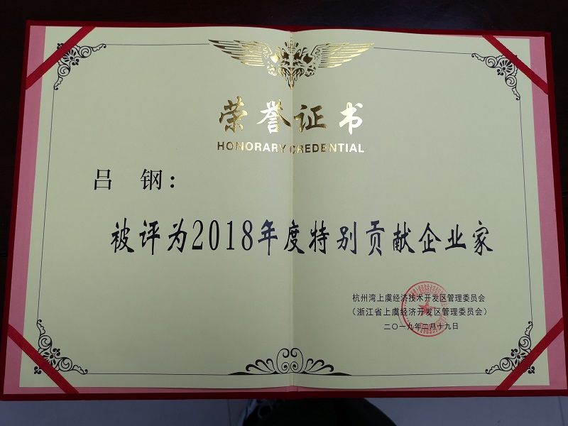 2月19日,杭州灣上虞經濟技術開發區召開“聚焦項目、大抓落實”暨“三服務”推進大會。公司董事長呂鋼榮獲上虞經濟技術開發區"2018年度特別貢獻企業家”稱號。